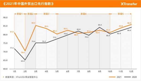 尽管如此,中国外贸人仍然交出了一份可圈可点的成绩单。XTransfer指数报告第一部分《2021中国外贸出口先行指数》显示,2021年,中国外贸出口先行指数呈高水平、稳定态势。据海关统计,2021年,我国货物贸易进出口总值39.1万亿元人民币,其中出口21.73万亿元人民币,同比增长21.2%。