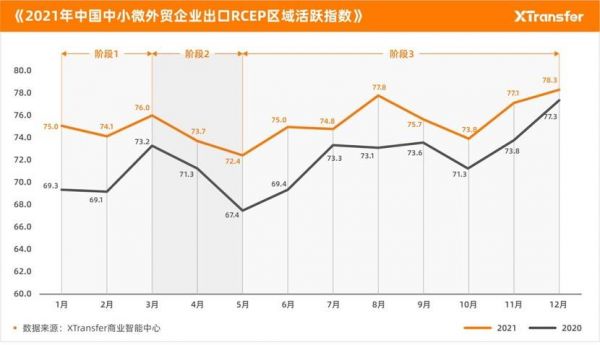 对于中小微外贸企业,RCEP的生效也将产生深远的影响。XTransfer指数报告第三部分《2021年中国中小微外贸企业出口RCEP区域活跃指数》显示,2021年中国中小微外贸企业出口RCEP区域活跃指数表现出了非常强的竞争力,预计2022年,中国中小微外贸企业RCEP区域贸易将会释放出前所未有的能量。
