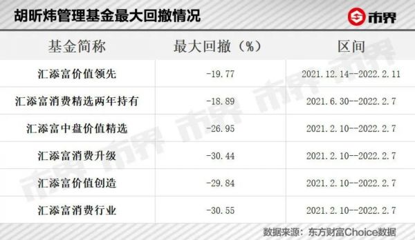 2021年2月10日以来,胡昕炜管理的基金净值持续回撤。2021年2月10日至2022年2月8日,其代表基金汇添富消费行业回撤达到30.55%,是自胡昕炜接手以来的最大回撤,其他基金也未能幸免。