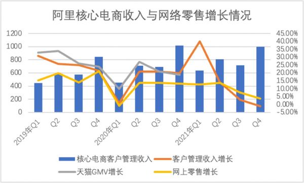 2021年Q4,阿里核心零售客户管理收入首次录得负增长,成为本季度财报最大的“亮点”,但当我们将拉长时间线,并加上天猫GMV和全国网上零售大盘的同比增长后,就又发现: