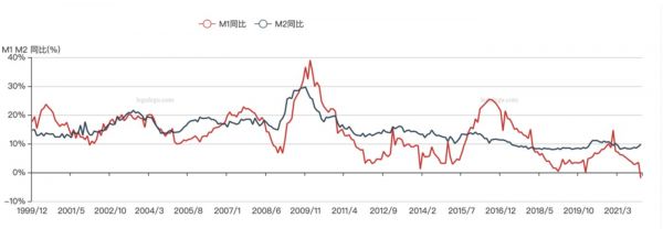 这是我国M1和M2同比增长情况,其中M1增长回到了历史的冰点,两者剪刀差放大,用经济现象解释数据则是:居民普遍“惜购”,活期存款持有量下降,转为流动性较弱的定期存款。