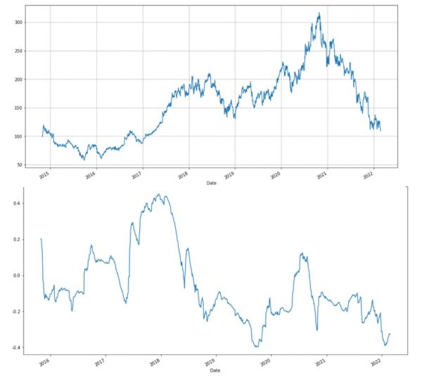 上图是我们制作的从2021年11月迄今为止,阿里交易量与股价的分布图,图中拟合线乃是呈水平状,也就是说,即便股价有如此大的波动,但成交量依然保持大致同一水平。