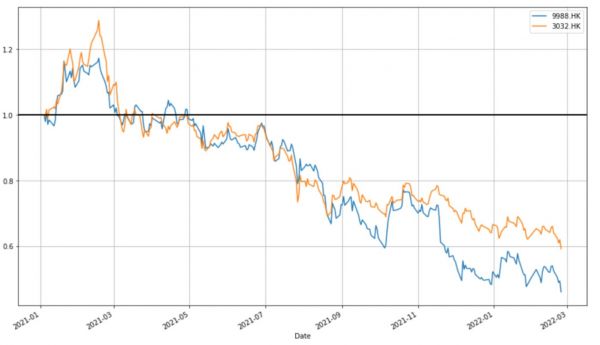 上图是以2021年1月1日为起点,香港恒生科技指数基金和阿里股价收益率情况,可以看到两者在过去一年多时间里,收益率几乎呈同步下行,直到2022年末后阿里股价大幅下行才开始落后指数基金。