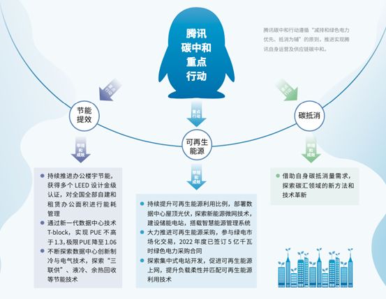 整体来看,腾讯碳中和行动遵循“减排和绿色电力优先、抵消为辅”的原则,通过技术及管理实现节能提效,可再生能源的开发、利用和采购,以及碳抵消方式共同推进腾讯自身运营及供应链2030年碳排放“净零”。