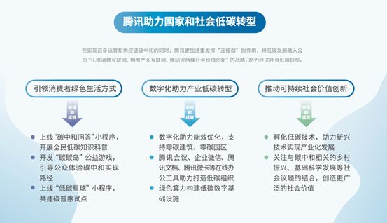 作为互联网行业的代表企业,腾讯显然并不能仅止步于自身运营及供应链的“净零行动”,更应该注重发挥“连接器”的作用,在多方面助力国家和社会的低碳转型。
