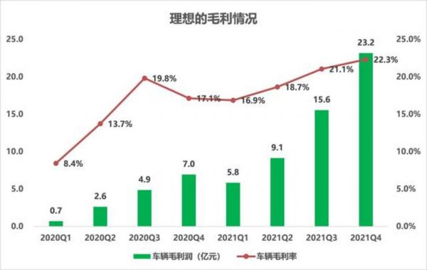 理想光靠卖车就能赚钱。一个直接证据是,理想的汽车销售毛利率一直在提升——从2020年一季度的8.4%,提升至2021年一季度的18.7%,再到2021年四季度的22.3%。