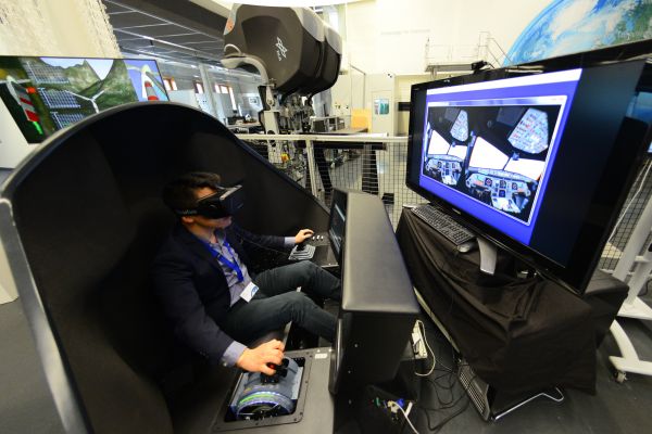 公司创始人吉洋博士在DLR系统仿真实验室操控飞机模拟器