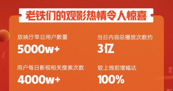 其次是快手在春节期间上线了放映厅频道,举办“快手放映厅春节免费看”活动,根据其活动报告,单日最高有近5000万用户进入快手放映厅,每天用户搜索影视内容超4000万次。