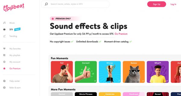 除了音乐,Uppbeat现在还提供音效和剪辑库,通过2021年9月对网站的扩展,可以很好地用于meme风格的内容。