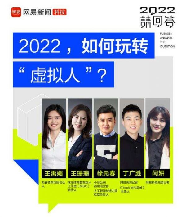 2022年2月23日,网易科技频道年度策划“2022,请回答”大咖线上对话栏目第四期《2022,如何玩转“虚拟人”?》直播现场,小冰公司首席运营官、人工智能创造力实验室负责人徐元春、咪咕体育数智达人(MSC)工作室负责人王珊珊、知春资本创始合伙人王禹媚相继出席。