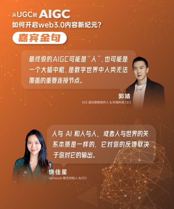 仅围绕科幻小说或科幻电影的视角去畅想如同空中楼阁。为此,知春资本邀请到了在音乐领域和情感社交领域,用AIGC做创新的被投企业创始人——ACE虚拟歌姬制作人、时域科技CEO郭靖,Gemsouls联合创始人、CEO饶佳星,他们结合自己的创业实践出发,与知春资本投资副总裁付冲一起分享了对AIGC(AI generated content,使用人工智能技术创造内容)最新见解。