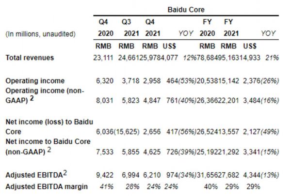 财报数据显示,2021年第四季度,百度实现营收331亿元,归属百度的净利润(非美国通用会计准则)达到41亿元;2021年全年收入1245亿元,同比增长16%。其中,百度核心业务(剔除爱奇艺业务之外的其他所有业务,包括在线营销业务和非在线营销业务)收入952亿元,同比增长21%;在线营销收入740亿元,同比增长12%;非在线营销收入212亿元,同比增长71%。爱奇艺收入306亿元,同比增长3%。