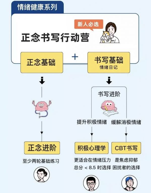 经历近2年的研发和内测后,2019 年 9 月「暂停实验室」推出首个产品——「情绪减压计划——正念书写基础营」。这是一个「为期 25 天、每天 20 分钟左右的在线自助练习计划」,手机上即可完成。练习方案则源自临床心理学研究与应用最广泛的循证干预体系,例如认知行为疗法,接纳承诺疗法,正念认知疗法等。