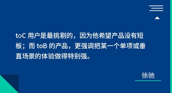 徐驰:无论toB还是toC,把产品打磨好是最重要的。toC用户是最挑剔的,因为他希望产品没有短板;而toB的产品,更强调把某一个单项或垂直场景的体验做得特别强。