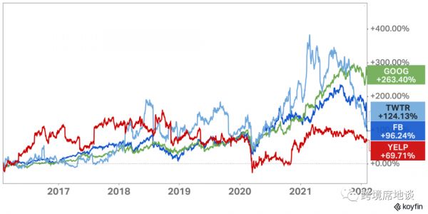 这篇文章在当时是有先见之明的。Yahoo从此被各个后来者超越,LinkedIn在几个月后被微软收购,即使Yelp和Twitter的股价在此之后差不多翻了一翻,但对比Google和Facebook的股价上涨就显得苍白无力了: