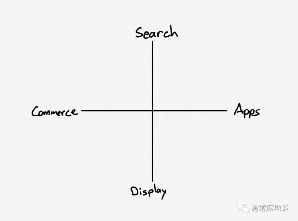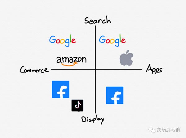 不过虽然对于投资人来说Facebook的财务预测令人失望,但这个季度的收入仍在270亿-290亿美元区间。它仍然是巨头主导的广告市场三大玩家之一,当然不远处正奔来一支黑马。要描述这个市场——当然这里仅仅是对这个巨大而多样的市场的极简描绘版本——让我们设想一个2✖️2的矩阵,横轴定义为app和电商,纵轴定义为搜索和展示: