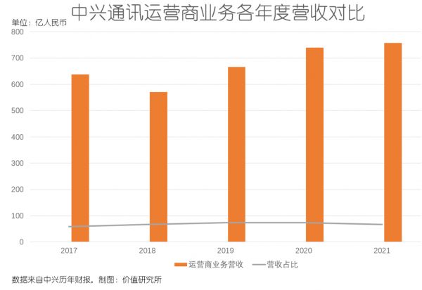 需要注意的是,在过去几年间运营商业务的营收占比一直高居不下,一度达到77%。价值研究所认为,在业务营收增速下滑的背景下,中兴继续依赖运营商网略业务打江山并不保险,未雨绸缪很重要。