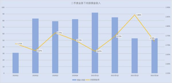 二手房业务中,贡献更大的仍然是贝壳旗下的链家门店,佣金率在三季度曾有过一个明显的提高,达到2.86%的水平,但四季度又回落至与此前相近的2.72%。