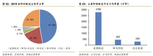 西南证券整理的一份数据显示,2019年即时配送主体市占率中美团、蜂鸟和达达为市场前三名,其中美团以47.2%位居第一,领先第二名超过半数份额,从订单量来看,也是美团遥遥领先。