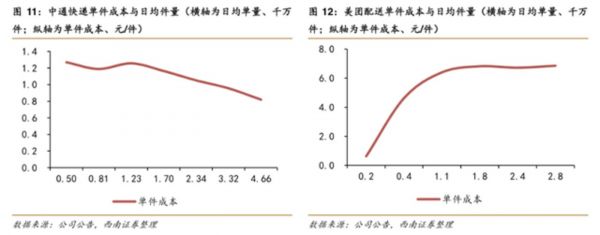 以美团外卖和中通为例,中通在日均单量从1000万/天爬升至4700万/天过程中,中转运输成本从1.2元/单下降至0.8元/单,降幅近50%;而美团外卖日均单量从1100万单/天增长到 2800万单/天的过程中,单件配送成本并未下降。