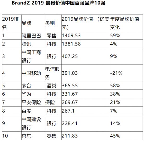 WPP和凯度发布了“BrandZ™ 2019最具价值中国品牌100强”排行榜,其中,阿里巴巴首次荣膺榜首,其品牌价值同比增长59%,达到1410亿美元。此次排行榜显示,文化娱乐类品牌以186%的增速成为同比增长最快的品牌类别;科技类品牌占100强企业的品牌总价值的26%,小米、滴滴、美团等17个品牌首次入选;人工智能、电子商务、新零售以及社交媒体平台领域的创新品牌表现尤为强劲。
