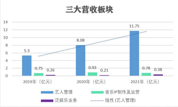 整体来看,乐华集团业务由三部分构成:艺人管理、音乐IP制作及运营和泛娱乐业务构成。其中的艺人管理一项,在2021年已经占到总营收的91%,其余两项业务近三年的增长几乎停滞。“音乐IP制作及运营”近三年总计收入约2.5亿,王一博的《无感》和《我的世界守则》销量分别为1700万张和1500万张,按市场价一张3元计算,两首单曲营收近亿元。