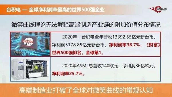 比如,我们大多数人都猜不到全球世界500强净利润率最高的公司是台积电,一家做芯片代工的公司,净利润率在去年已经达到38.7%,这是世界500强里最高的;还有荷兰的ASML,做光刻机的高端制造业公司,净利润也达到了25.7%。这些高端制造业公司的净利润率打破了我们对“微笑曲线”的常规认知。