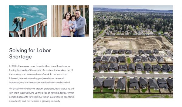 该公司致力于研发3D打印技术,利用全栈机器人和辅助工具进行房屋建造。应对美国住房市场的供给缺口,该公司称其技术能够显著降低房屋建造成本,替代一半以上的人力劳动,同时大幅缩短建造时间:平均耗时九个月建成的住宅如果改用该公司的机器人,只需要一个月时间就能完工。