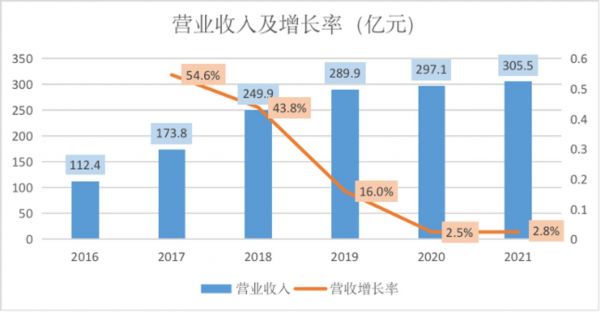 从年度营收增速来看,公司主营业务增长一直处于下行通道,目前已几乎停滞。2021全年营收增速仅2.8%,与2017年的54.6%早已不可同日而语。