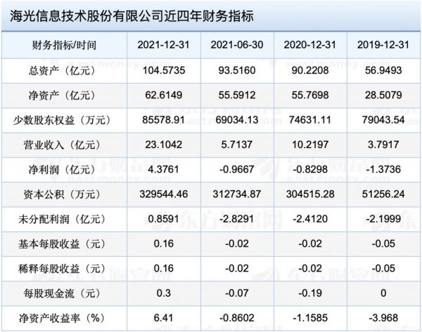根据2021年11月8日海光信息首次披露的招股书书(申报稿),2018年至2021年上半年,公司营收分别为0.48亿元、3.79亿元、10.22亿元和5.71亿元,净利润分别为-1.8亿元、-1.37亿元、-0.83亿元和-0.97亿元,扣非净利润分别为-1.74亿元、-0.93亿元、-0.95亿元和-0.68亿元。