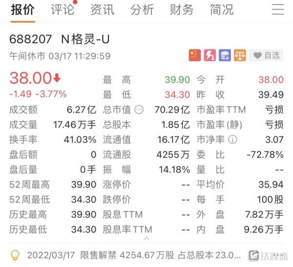 上市首日,格灵深瞳(N格灵-U)遭遇破发,开盘价为38.00元/股,较发行价39.49元/股下跌3.77%,随后跌幅一度超过10%。截至3月17日午盘休市,跌幅收窄,格灵深瞳股价与开盘价一致,为38.00元/股,最新市值达到70.29亿元。