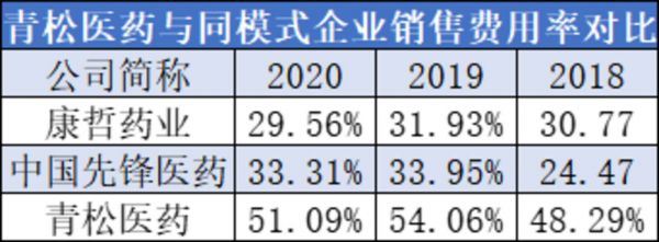 如上所述,青松医药归类医药制造业并不被证监会认可,所以在招股书中,公司还列举同业务模式的上市公司康哲药业(00867.HK)、中国先锋医药(01345.HK)进行类比,但公司销售费用率显著高于同行。对此,公司仅是简单解释,主要产品的治疗领域、供应商谈判能力、经营策略方面的不同导致。