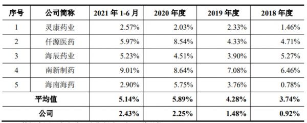 而营销的大手笔背面,是对研发投入的“小气”。2018年-2020年、2021H1,青松医药研发费用率仅0.92%、1.48%、2.25%、2.43%。公司自称医药制造企业,但与公司列出的同行灵康药业、仟源医药、海辰药业、南新制药、海南海药对比,其研发费用率长期垫底。