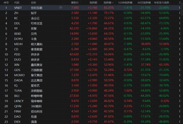 盘面上,热门中概股迎来一波暴力反弹,互联网、新能源、半导体等板块涨幅惊人。其中,涨幅最高的世纪互联收涨83.25%,知乎、金山云涨逾70%,叮咚买菜、贝壳、斗鱼涨幅在60%以上,阿里巴巴、京东、百度也都收涨逾30%,全日共有79只中概股涨幅在20%以上。