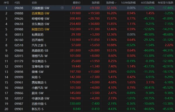 恒指高开高走,收涨1400余点,涨幅达到7.04%,恒生科技指数也是全日飘红。盘面上,SaaS、汽车、手游、银行股走高,回港中概股也几乎全线收涨。其中,涨幅最高的万国数据收涨32%,百度、哔哩哔哩、京东、阿里巴巴等8只个股涨幅也在10%以上。