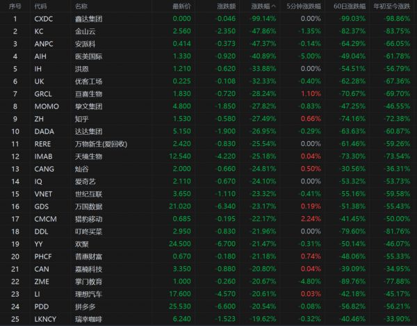 跌跌不休:中概股连日遭血洗,半数个股股价跌剩一成