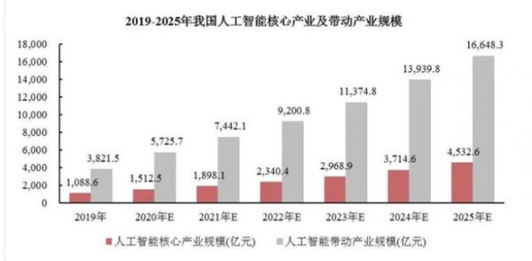 随着AI技术的逐渐成熟,科技、制造业等业界巨头布局的深入,人工智能的应用场景不断扩展。据艾瑞发布的《中国人工智能产业研究报告(2020 年)》报告显示,2019 年,中国人工智能核心产业及带动产业规模分别为 1,088.6 亿元和 3,821.5 亿元,预计至2025 年将分别达到 4,532.6 亿元和 16,648.3 亿元,年均复合增长率分别为 26.8%和 27.8%。