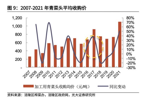2017年至2021年青菜头平均收购价变化 数据来源:光大证券