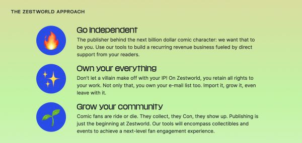 Ohanian表示,对于漫画创作者来说,以数字形式发布他们的作品并与粉丝联系的现状非常糟糕。Zestworld将漫画创作者的业务和社区的各个方面整合到一个集中的平台上,这打破了漫画创作者发布和拥有IP的方式,同时也让粉丝能够以全新的方式直接与创作者联系。