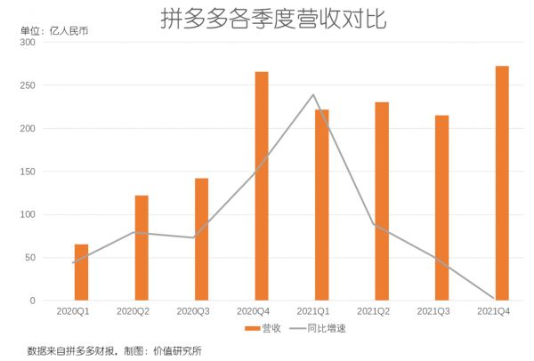 数据显示,拼多多四季度营收272.3亿,同比增长3%;2021财年全年营收则为939.5亿,较2020年的594.9亿增长58%。从四季度首次跌至个位数的同比增速来看,拼多多的退步也非常明显。