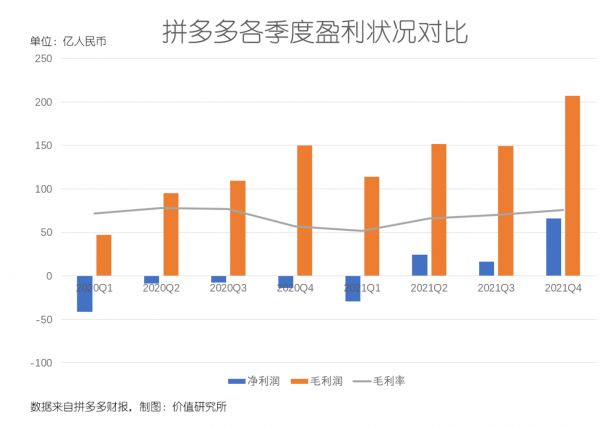 数据显示,拼多多四季度归母净利润为66.2亿,净利润率达到31%,去年同期为净亏损13.8亿,进步巨大。2021年全年,归属拼多多普通股东净利润也高达77.7亿,2020年则为净亏损71.8亿。