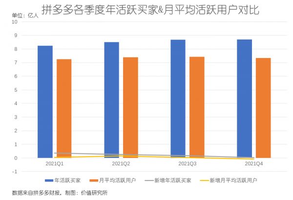 数据显示,2021年前三个季度拼多多月新增平均活跃用户分别为470万、1390万和300万,但四季度为负增长810万。此外,四个季度的年活跃买家分别为8.24亿、8.5亿、8.67亿和8.69亿,增幅分别为3500万、2610万、1700万和140万,下滑速度也相当惊人。