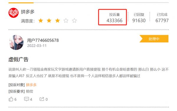 根据价值研究所的观察,这已经不是拼多多第一次出现类似投诉了。在黑猫投诉平台上输入关键词“拼多多”,出来的结果多达43万条,其中就包括大量针对虚假广告、砍价规则与平台宣传不符的投诉。