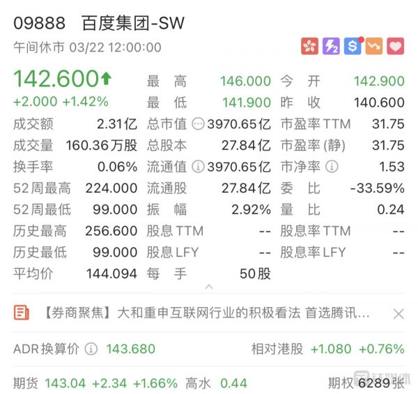 截止3月22日午盘,百度集团港股(09888.HK) 小幅上涨,涨幅达1.42%,报142.60元/股,市值为3970.65亿港元。相比去年3月23日百度二次上市时,仅一年时间,百度港股就蒸发了3230亿港元市值。(详见钛媒体App前文:《“AI第一股”诞生:百度回港IPO,市值近7200亿港元》)