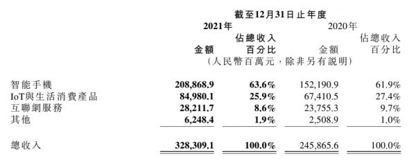 在2021年的全年营收中,小米的智能手机业务收入为2088.69亿元,占总营收比例为63.6%,而2020年这一比例为61.9%。同时,2021年小米的IoT收入为849.80亿元,占总营收比例为25.9%,相比2020年下降了1.5个百分点;互联网服务收入则为282.12亿元,占总营收比例为8.6%,相比2020年下降了1.1个百分点。