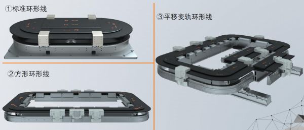 池峰:果栗科技为客户提供磁悬浮柔性智造线解决方案,我们主要有三个系列产品。一是最先发布的全磁悬浮环形线,类似操场的跑道,产线上的物品是在平面上进行环形运动,转向时作圆弧运动。这个系列包括标准环形线、方形环形线和平移变轨环形线。