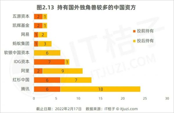 根据 IT 桔子数据,持有国外独角兽数量最多的中国资方是腾讯。腾讯投资了24家国外独角兽公司;其中,1/4 是在早期阶段投中的,另有 3/4 是腾讯在国外公司成为独角兽之后或同时投进的。这说明腾讯捕获海外独角兽主要依靠的极力挖掘具有潜力的成长型公司。