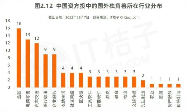 中国资本持有的国外独角兽数量超过 10 家的还包括电商零售、汽车交通行业,分别有 13 家、12 家。企业服务、医疗健康领域也有 9 家国外独角兽被中国资本投资过。在其他行业领域,中国资本所持有的独角兽较为零散,一般在 3 到 4 家左右。