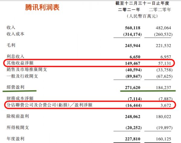 在这个基础上的一系列操作,使得腾讯在2021年取得的“其他收益净额”高达1495亿元,2020年为571亿元,这使得其2021年的经营利润同比增长了47%。但由于港股是先计算“其他收益净额”(主要是投资收益)后才得出经营利润;而美股是从毛利中扣除“三费”后直接得出经营利润,如果参照美股会计准则,剔除投资收益因素影响后,2021年不计入“其他收益净额”的主业经营利润甚至同比下滑了近4%(1271亿,1221亿)。