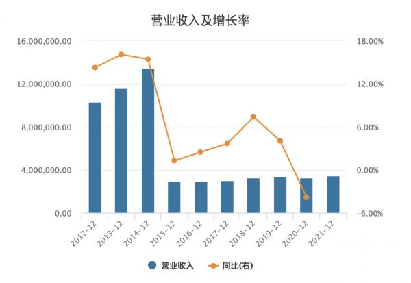 钛媒体APP梳理华润啤酒近10年年报数据发现,2012年至2014年,华润啤酒营收高速增长,到2014年底已跃升至1332.12亿元;2015年与SAB分手后,营收基本稳定在320亿元左右。具体来看,2015年至2021年,华润啤酒营收分别为291.72亿元、286.94亿元、297.32亿元、318.67亿元、331.90亿元、314.48亿元、333.87亿元。